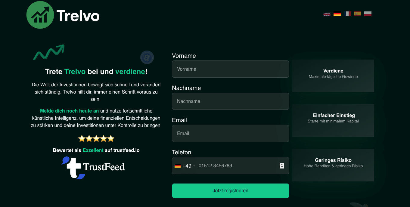 Handelsroboter sind Handelsplattformen, die den Händlern helfen, Kryptowährungen zu einem günstigeren Preis zu erhalten und zu einem konkurrenzfähigen Preis zu verkaufen. Solche Bots sind bestrebt den Händlern im Devisen-, Krypto-, Rohstoff- und Aktienmarkt sowie anderen Dienstleistungen unter anderem den komfortablen Zugriff darauf zu ermöglichen. Trelvo ist einer der besten auf dem deutschen Markt, da es den Benutzern weiterhin verschiedene Chancen auf dem Markt bietet. Es ist ein vollautomatischer Betriebsroboter, der den Nutzern bei der Erkennung von Marktchancen für den Kauf und Verkauf auf dem Markt unterstützt. Das Ziel von Trelvo ist es, den Handelsprozess so reibungslos wie möglich zu gestalten. Dies erreicht es, indem es den Händlern ermöglicht, ihre Aufmerksamkeit auf den Handel zu lenken und die technischen und administrativen Aufgaben dem Roboter zu überlassen.